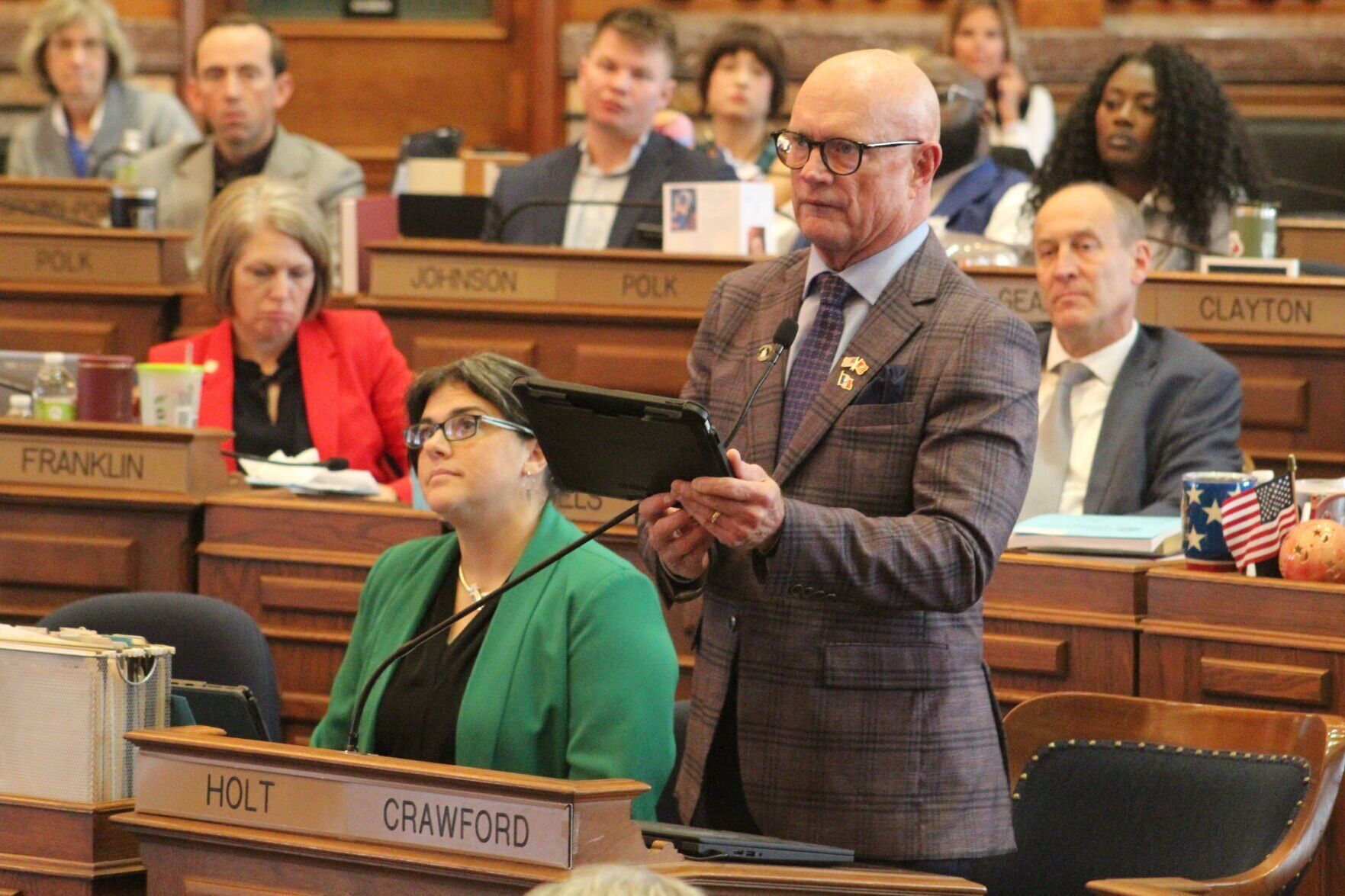 Iowa Rep. Steve Holt, R-Denison, speaks about legislation addressing property rights and eminent domain policy during debate at the Iowa Capitol in Des Moines on Wednesday, Jan. 21, 2026.